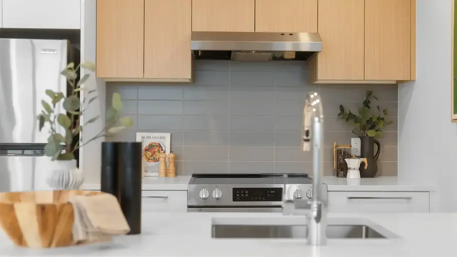 • Polished Quartz countertops and ceramic tile backsplash