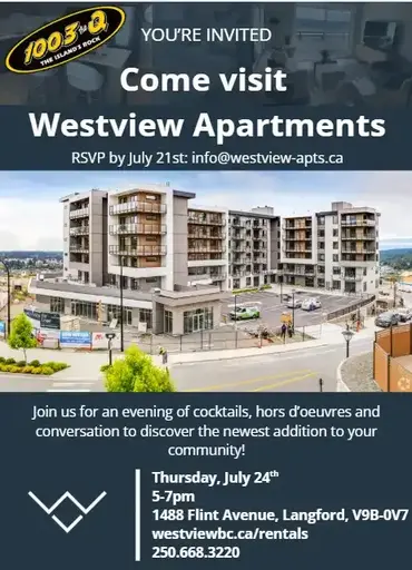 ** Open House July 19th 9am-1pm ****Visit our open house and be eligible for exclusive incentives, including 3 months free parking, 1 month free rent, gift cards, and more!**PANORAMIC WESTSHORE VIEWSNow renting brand new luxury 1&2 bdm apartments with sweeping views of the Olympic mountains, Langford Lake and the Juan de Fuca Straight.Standing on Skirt Mountain steps away from hiking and mountain biking trails, minutes from Highway 1, downtown Langford and on BC Transit Route 49.A short drive from the golf, spa, tennis facilities at Bear Mountain, Langford Lake, Jordie Lunn Bike Park and parks. Enjoy year-round Westcoast outdoors activities minutes from schools, groceries, shopping and restaurants at Millstream Village.Need a different layout? We have different floorplans to choose from. Visit our website or call us to pick your favourite unit and register today!www.westviewbc.ca/rentals250-668-3220rentatwestview@gmail.com