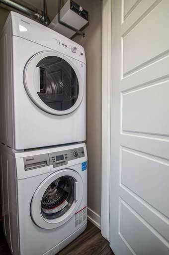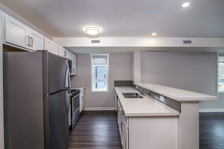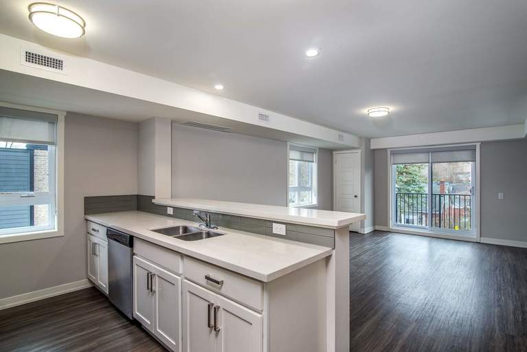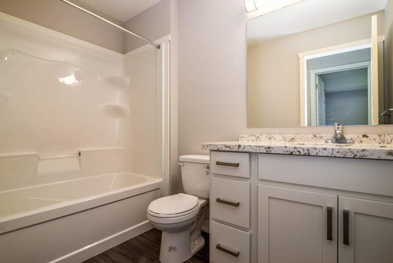 Spacious 1, 2 and 3 bedroom townhome designs with hardwood flooring in living room and bedrooms and stone-like ceramic tile in the kitchen. Large, renovated suites with contemporary white finishes. Remodeled bathroom with vanity, cabinetry, counter, and chrome finishes.