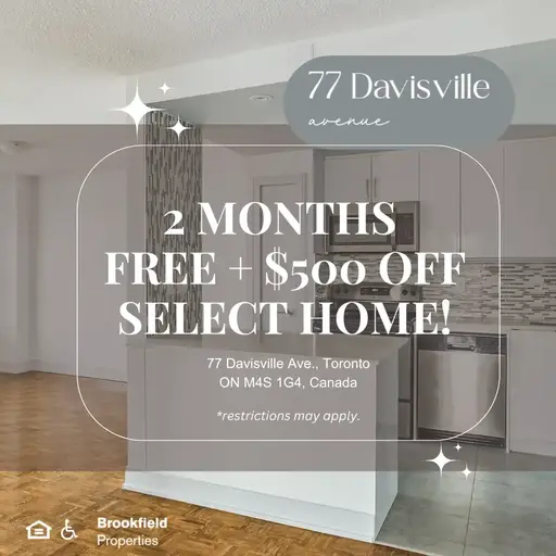 Welcome to 77 Davisville. Located in the sought-after neighbourhood of Davisville Village, our apartments are surrounded by parks and trails, schools, restaurants, and retail for the ultimate convenience. From stunning skyline views to condo-style amenities, life in our Toronto apartments is pretty sweet. From spacious floor plans to delightful details, apartments at 77 Davisville deliver an amazing living environment. Our newly-renovated homes offer sleek stainless steel appliances, balcony options with beautiful city views, spacious open-concept floorplans, and more! Featuring scenic views, our rooftop terrace is adjacent to an indoor pool and sauna, making it the perfect place to hang with friends and enjoy a laid-back lifestyle. Our courtyard is brimming with lush green spaces, sculpture gardens, and ample seating, providing an idyllic atmosphere to relax, meditate, and take in the fresh air. 77 Davisville is also a pet-friendly community complete with indoor, bicycle storage and a 24-hour laundry facility with complimentary WiFi. Schedule your personalized tour today and discover your new Toronto home!Contact us today at 647.925.6665 or by email 77davisville@bpapartments.com to learn more. We look forward to working with you to find your perfect home.