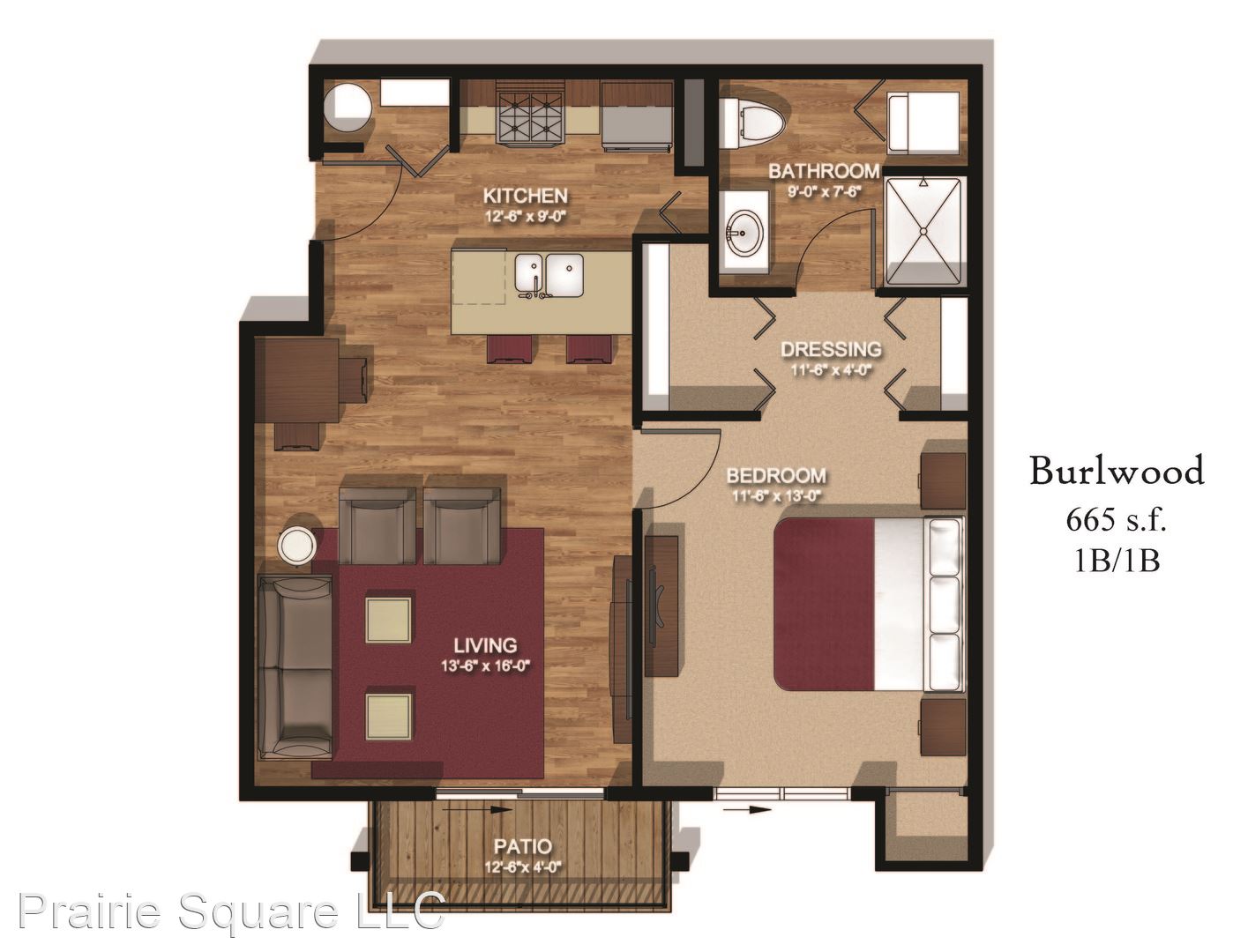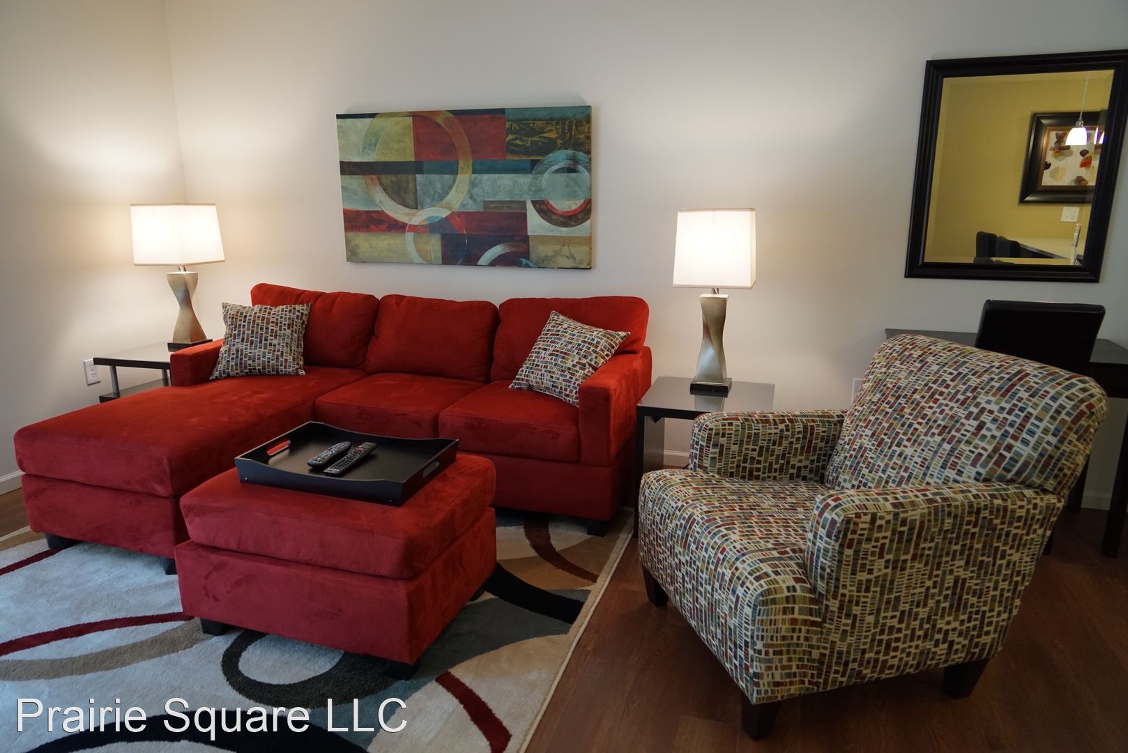 Fully Furnished - Dogwood - Second Floor with Vaulted Ceiling - This all new fully furnished two bedroom two bathroom deluxe unit located on the second floor features a vaulted ceiling in the living room, convenient living with a washer and dryer in the unit, large flat screen TVs in the living room and bedrooms, all GE stainless style appliances, Quartz stone tops and wood style plank floors. The fully furnished unit contains lush, contemporary décor, large, hi-tech, hi-definition, smart TVs, dinnerware, flatware, drinkware, cookware, cooking utensils and bakeware. Amenities incorporated in the contemporary kitchen include a gas range, frost free refrigerator and freezer with ice maker, microwave/vent hood, dishwasher and garbage disposal. Depending on the weather, you'll be glad to have gas heat and central air in your unit. Don't forget to relax on your balcony. Reserve your unit today! Prairie Square only allows Assistance Animals. Pets are not permitted. Prairie Square is a non-smoking property. This unit includes gated, secured parking for one vehicle with the option to add a second vehicle for an additional gate access remote control security deposit of $250. www.prairiesquarerentals.com