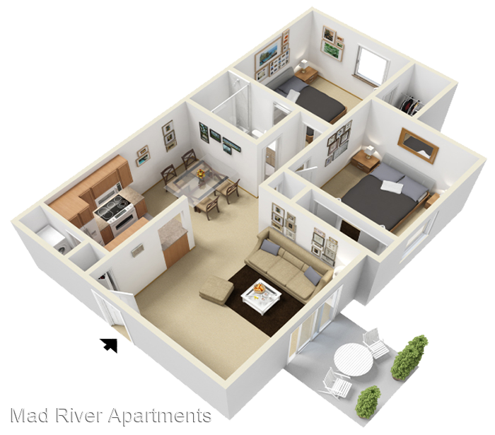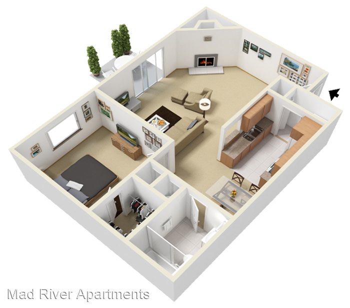 The Riverview - Roomy two bedroom, one bath with ample closet space and full sized washer & dryer. The living room flows perfectly into the dining room, making this spacious two bedroom layout ideal for entertaining. Vaulted Ceilings* Walk-In Closets* Fireplaces* Washer/Dryer Cable Ready *In Select Units