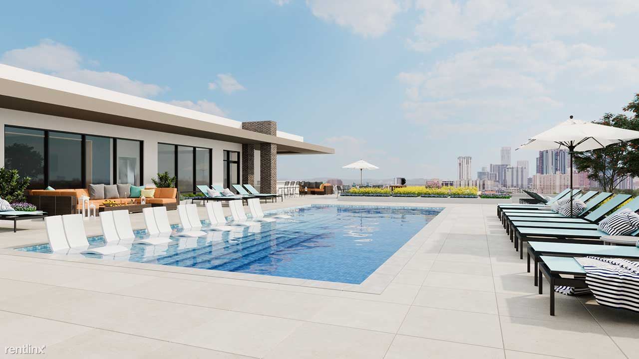 Seventh-floor rooftop terrace with lavish amenity deck, saltwater pool, outdoor kitchen and skyline views of Austin